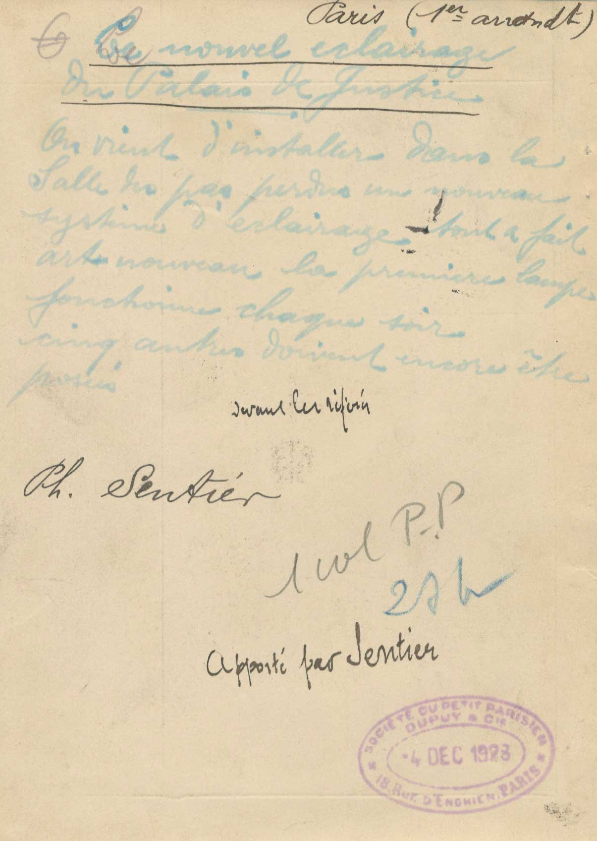 Dos : Copyright « le Petit Parisien 1928 », annotations.